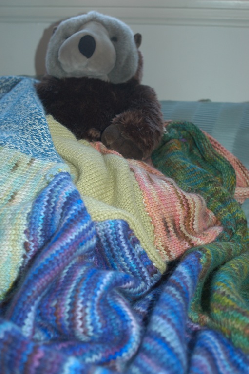 | Alpaca Blanket | This started more as a hoot, than a project. Using an infamous Joanne's 50% off coupon, I acquired an even more spurious The Ultimate Sweater Machine. The USM is really a glorified knitting loom. It is great for making 1) squares, 2) bald spots as you pull your hair out. I opted for #1, and started picking up soft alpaca skeins wherever I found them. I made six 2.5'x1.5' patches. I stitched these together to make the blanket you seem Hammie modeling. | ||